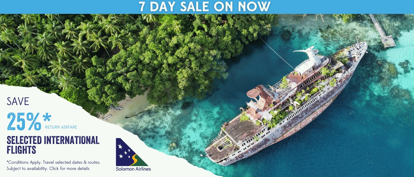 *Conditions apply. Valid on Solomon Airlines flights Brisbane to Honiara. Black out dates apply. Subject to availability