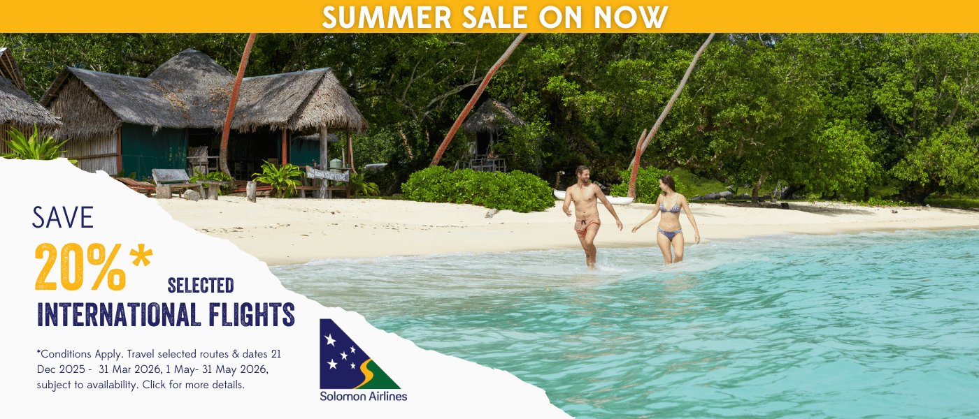 Fly to your favorite destinations at unbeatable prices! Enjoy discounted economy fares on selected international routes with Solomon Airlines. Book between 14 November and 1 December 2025 for travel from 21 December 2025 to 31 March 2026 and 1–31 May 2026.